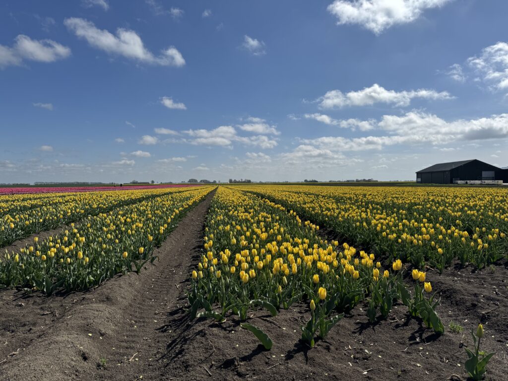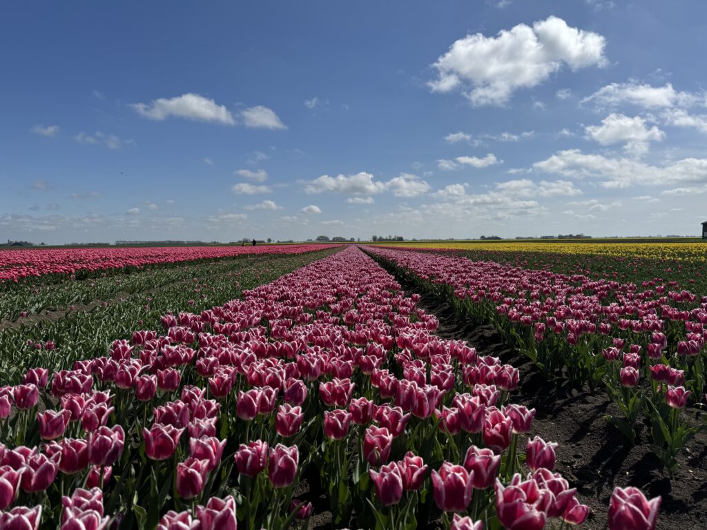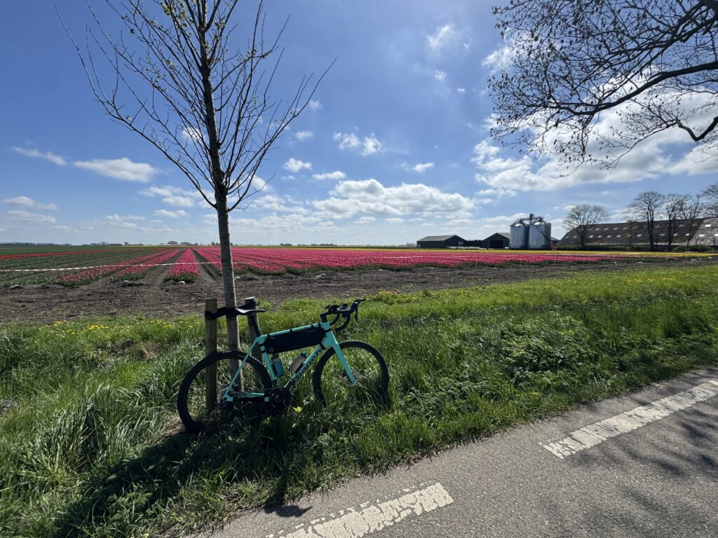 Wracałem z nad zatoki Dollard. Wiatr w plecy, słońce ogrzewało ramiona, a w głowie wciąż miałem obrazy z nadmorskich ścieżek. To miał być już tylko spokojny powrót – ale droga postanowiła mnie jeszcze raz zaskoczyć. Za zakrętem, pośród pól i gospodarstw, nagle pojawiły się one – tulipany. Całe ich morze. Czerwone, różowe, żółte – ułożone w perfekcyjnych rzędach, aż po horyzont.