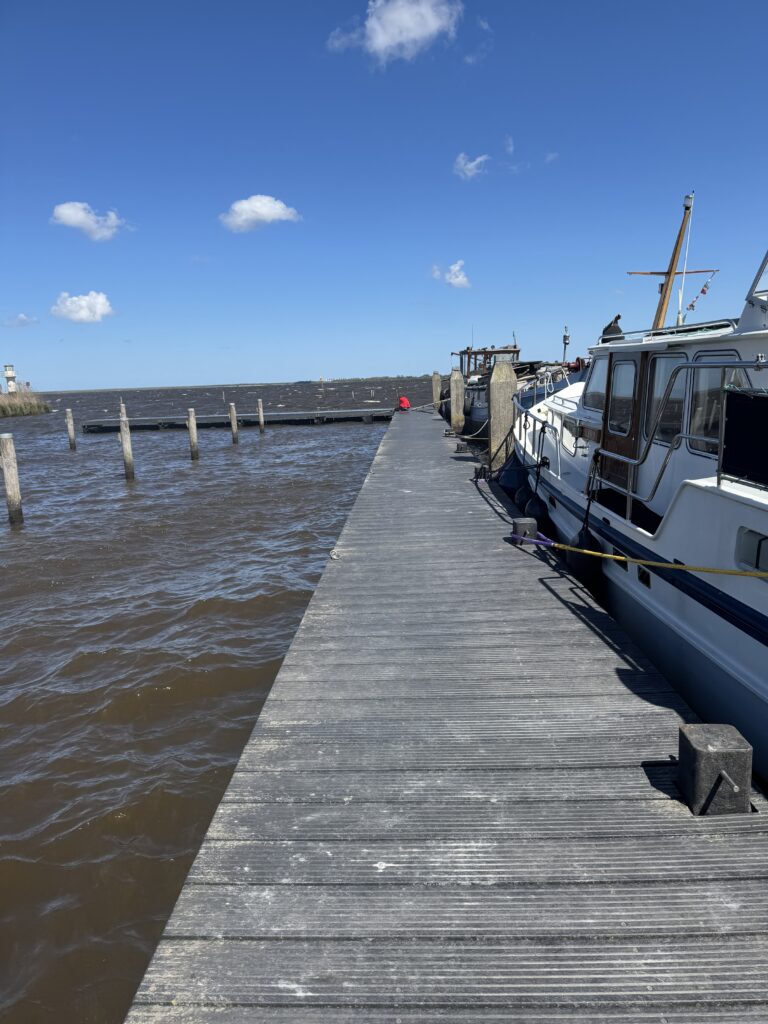 Ale życie potrafi zaskoczyć. W De Skâns Oostmahorn zaczepiła mnie starsza kobieta z nietypową prośbą – jej telefon wpadł do wody, gdy wysiadała z łodzi. Pomyślałem, że wystarczy zdjąć buty i wejść do płytkiej zatoczki. Szybko jednak okazało się, że to misja specjalna: z grobli zeszliśmy na stare, drewniane molo, a tam – wielka, zaniedbana łódź i ciemna, głęboka na ponad 2,5 metra woda. Próbowałem pomóc podbierakiem, ale bez specjalnego sprzętu nie było szans. Musiałem przeprosić starszą panią i pojechać dalej.